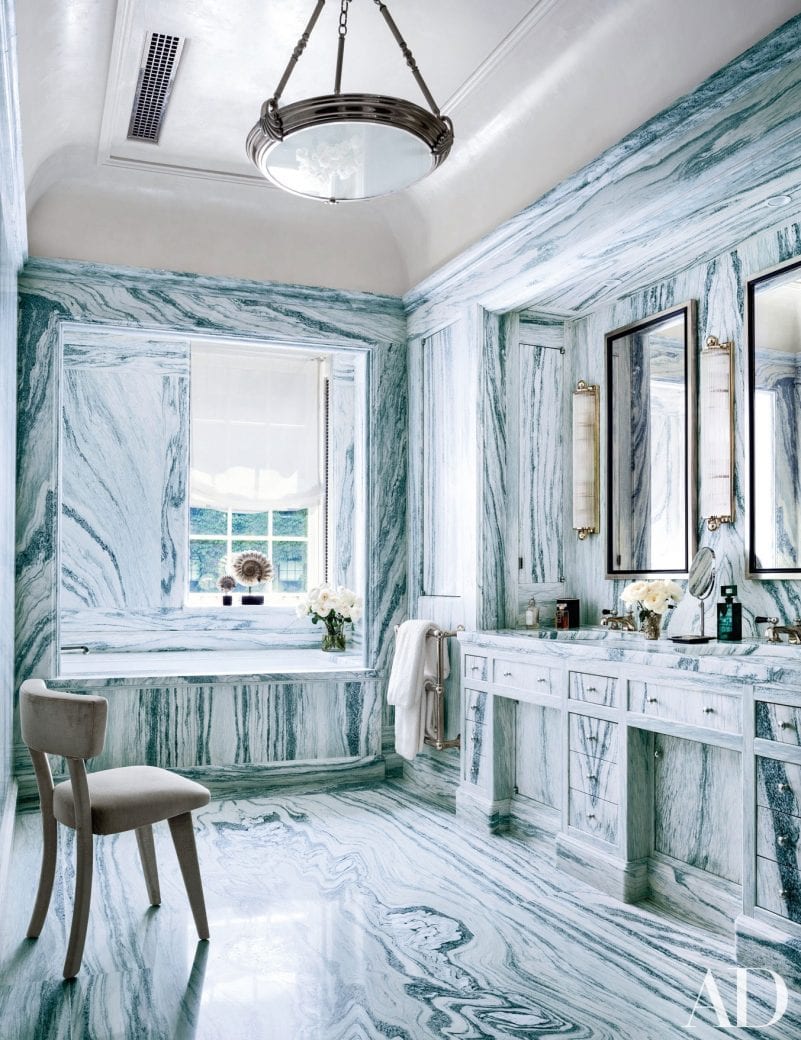 This gorgeous Manhattan townhouse was renovated by architectural and interior design firm, Sawyer | Berson, who’s bold design style epitomises luxury with use of plush, rich materials, references to art and well appointed fittings. This is certainly the case with this master bath. Every inch of the space has been cladded with stunning cipollino marble, from the floor and walls down to the cabinetry and tub. It was the firms intention to showcase the marble’s beautiful natural pattern in vibrant blue-green, cut and installed with incredible care so that the lines in the stone contrast, complement and please the eye, aligning where necessary (such as across the individually cut drawers). Discreet fittings were chosen to maintain focus on the marble. A clever sense of harmony is projected by the sweeping marble in calming blue, successfully making a statement while in-keeping with the desired tranquility of a bathroom space.