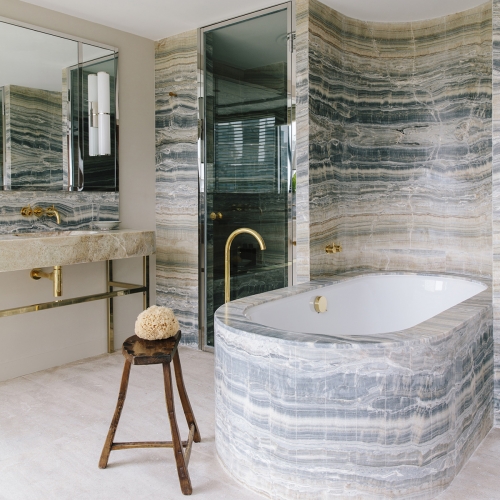 London based Studioilse create interiors with the philosophy that they must be comfortable, and if you flick through the firms portfolio of work, the spaces emit a sense of calm with the use of organic materials, velvety furnishings and a tendency for natural colours, with occasional accents of brights. A project was commissioned by the firm to design the interior of an apartment in the deluxe Embassy House building in Beijing’s diplomatic quarter, the striking curved exterior of the skyscraper inspired Studioilse to use curves on the apartments interior. Similar to Sawyer | Berson’s Master Bath, the firm cladded each wall of the bathroom in natural stone, but with a more simplified linear placement. The material has been carefully cut and installed to ensure the stripes in the stone run continuously around the width of the space. Not only is the fluidity pleasing and rather magnificent, but the choice to place the lines horizontally creates the illusion of greater space, as well as unifying the separate areas. Due to the more simplistic placement of the stone, contrasting brass fittings were chosen to bring out the warm, golden tones in the marble.