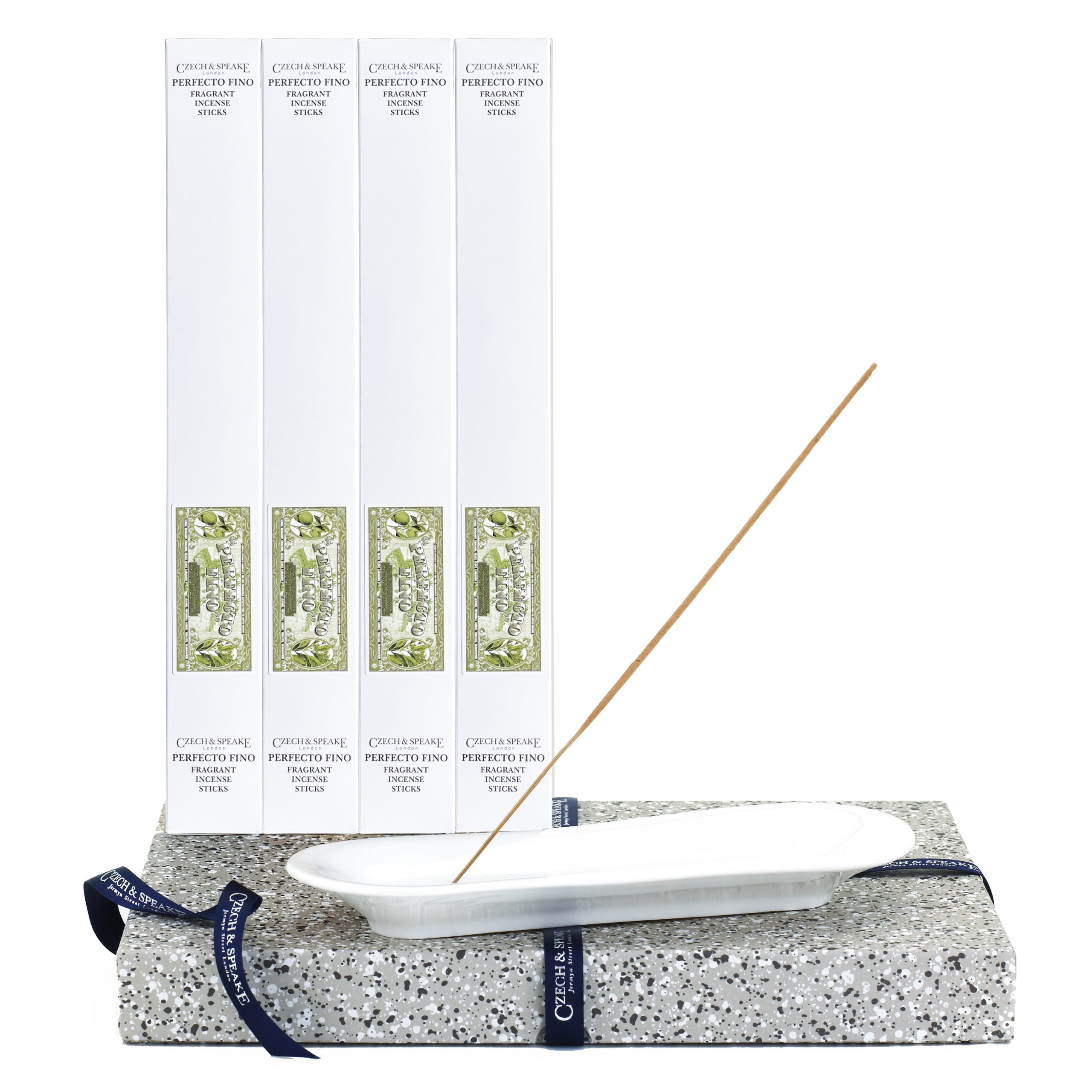 BEAUTIFULLY PRESENTED: including our signature fine porcelain incense dish with a branded metallic punctured gold disk and 4 packs of 20 fragrant Perfecto Fino incense sticks embellished in a uniquely designed striking black and white box